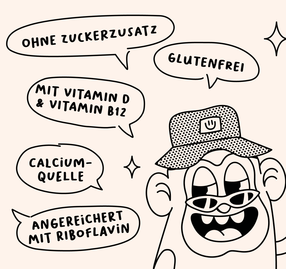 Zutaten: Wasser, glutenfreier Hafer (11 %), Rapsöl, Calciumcarbonat, Säureregulator: Kaliumphosphate; Meersalz, Riboflavin, Vitamin D, Vitamin B12.